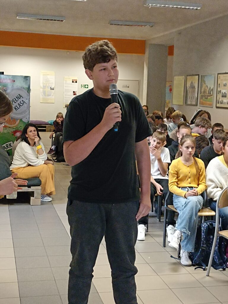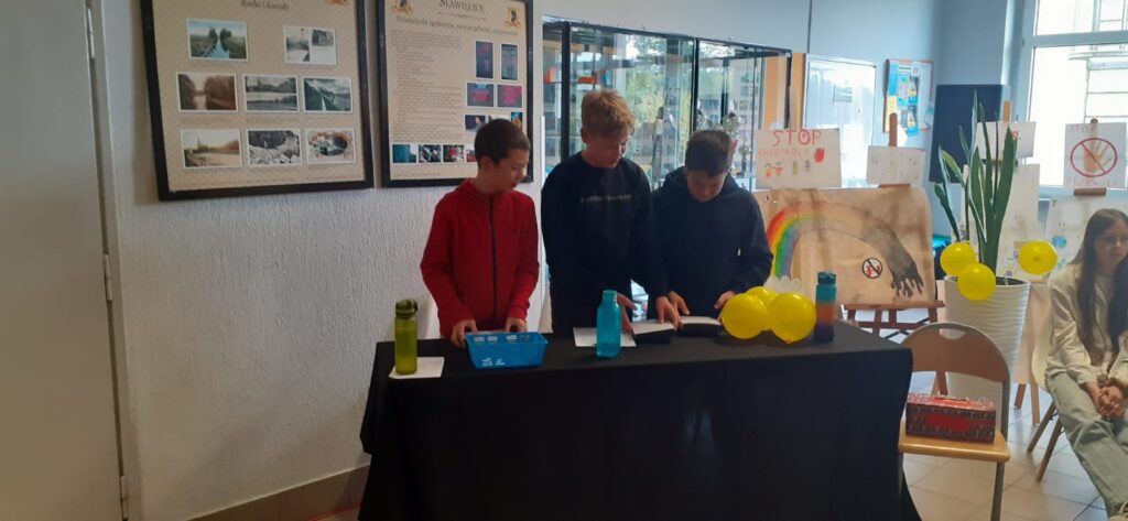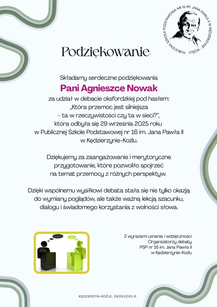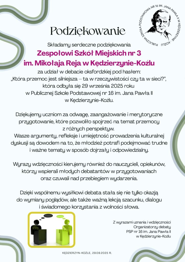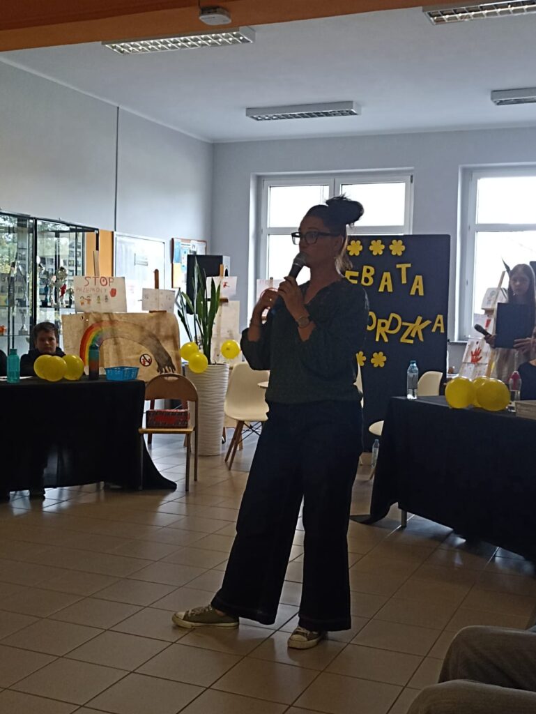 Serdeczne podziękowania kierujemy do wszystkich uczestników debaty, jak też do widowni, która w bardzo czynny sposób brała udział w tym wydarzeniu poprzez zadawanie pytań oraz dzielenie się swoimi doświadczeniami. Dziękujemy uczniom za odwagę, zaangażowanie i merytoryczne przygotowanie, które pozwoliło spojrzeć na temat przemocy z różnych perspektyw. Wasze argumenty, refleksje i umiejętność prowadzenia kulturalnej dyskusji są dowodem na to, że młodzież potrafi podejmować trudne i ważne tematy w sposób dojrzały i odpowiedzialny.