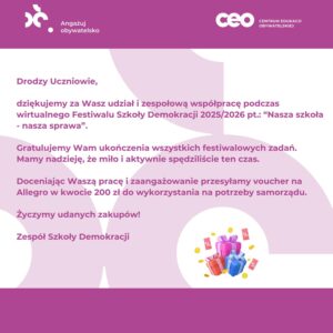 W bieżącym roku szkolnym nasza szkoła przystąpiła do programu „Szkoła demokracji 2025/2026”. Od początku roku szkolnego samorząd szkolny zrealizował szereg zadań związanych z tym projektem. W marcu uczestniczyliśmy w festiwalu „Nasza szkoła-nasza sprawa”, W wydarzeniu aktywnie uczestniczyli uczniowie samorządu szkolnego, którzy w ramach realizowanego w tym roku projektu wykonali wszystkie zaplanowane zadania.Praca zespołowa, zaangażowanie i pomysłowość uczniów zostały docenione – po zakończeniu festiwalu otrzymaliśmy voucher o wartości 200 zł, który zostanie przeznaczony na działania samorządu szkolnego.